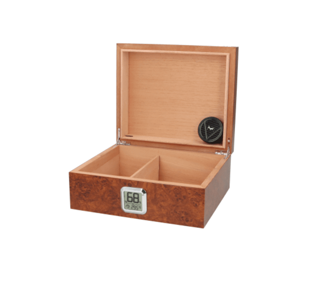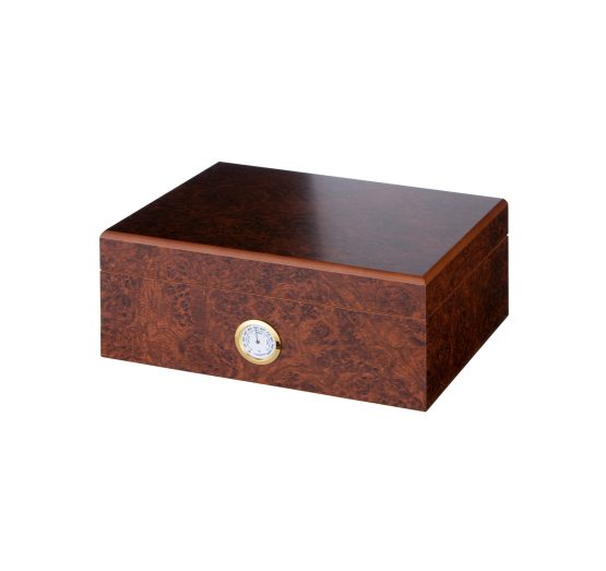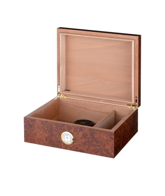 Mooi afgewerkte humidor van Spaans cederhout met walnoot fineerafwerking. De humidor heeft vergulde en verzonken scharnieren en is inclusief een ingebouwde hygrometer waardoor de humidor niet geopend hoeft te worden om de vochtigheid te lezen. De onderkant is met een vilten doek afgewerkt om meubels te beschermen.